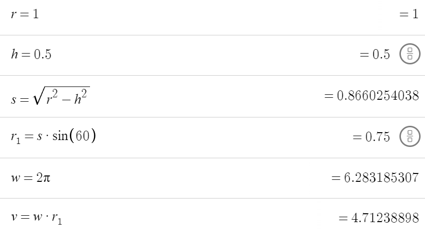 Es gilt: \({r > 0 \wedge r <= 1}: {r \in \mathbb{R}}\), \(d = 2r\), \(U = d{\pi}\), \(A = {\pi}r^2\), Umlaufgeschwindigkeit \(v = {\omega}r_{\perp}\), \({r_{\perp} = r{\sin} {\vartheta}}\).